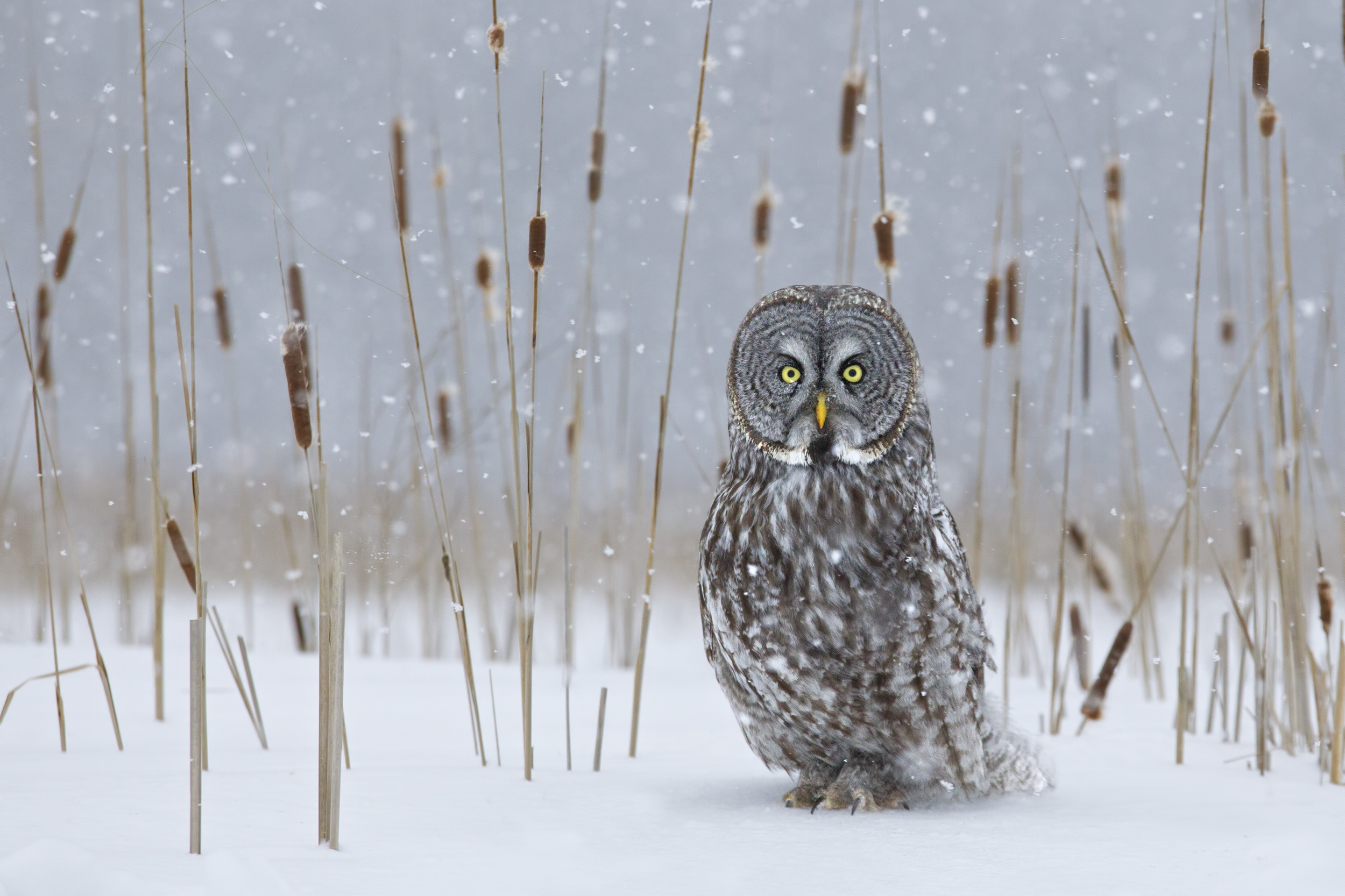 Great Grey Owl in Cat-Tails’ by Rick Dobson